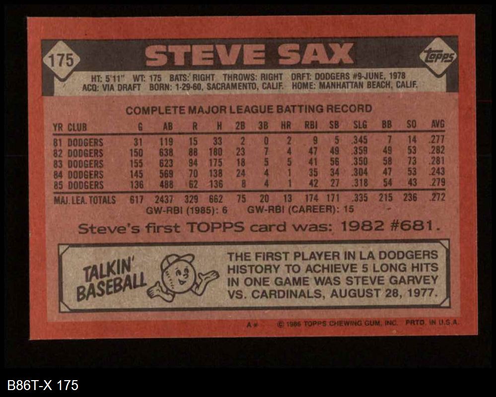1986 Topps #175 Steve Sax 8 - NM/MT