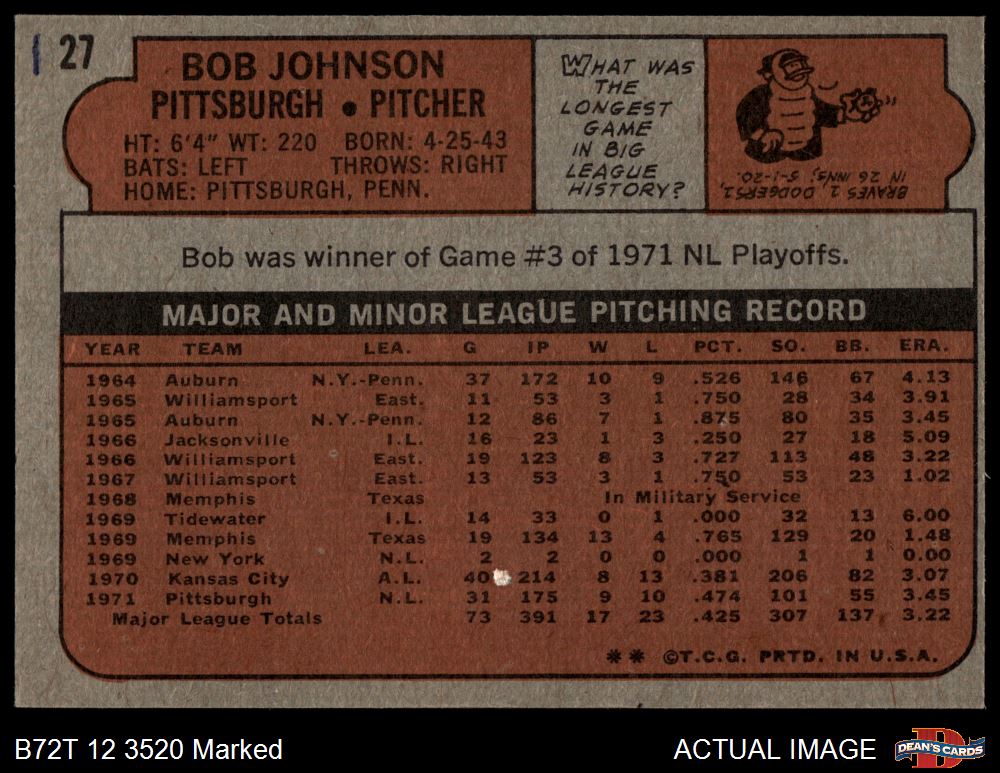 1972 Topps #27 Bob Johnson 1.5 - FAIR