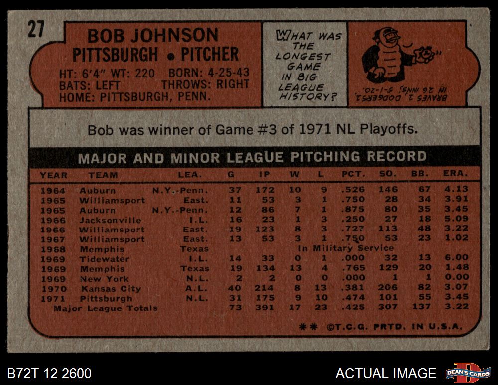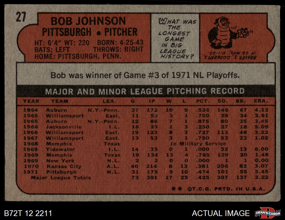 1972 Topps #27 Bob Johnson 3 - VG