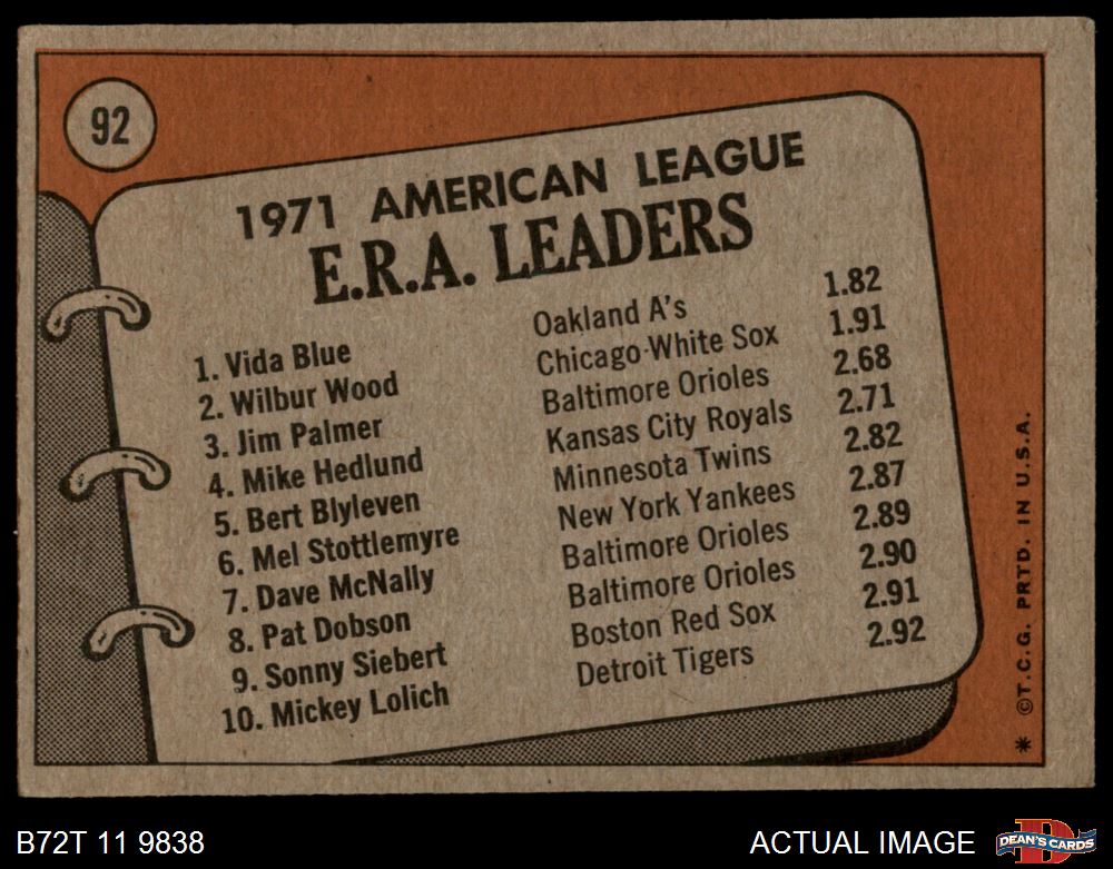 1972 Topps #92 - Vida Blue / Jim Palmer / Wilbur Wood AL ERA Leaders 1.5 - FAIR