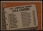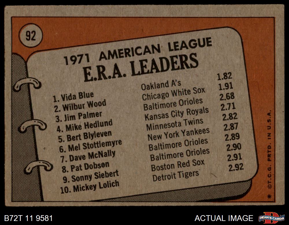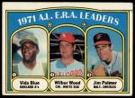 1972 Topps #92 - Vida Blue / Jim Palmer / Wilbur Wood AL ERA Leaders 3 - VG