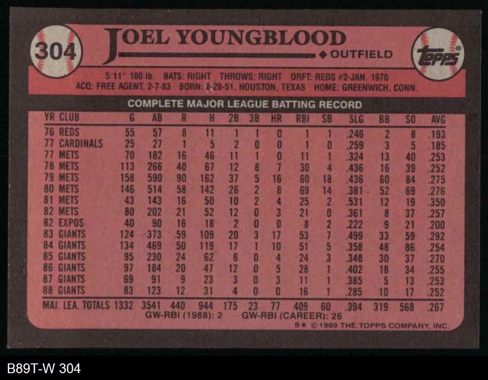1989 Topps #304 Joel Youngblood 8 - NM/MT