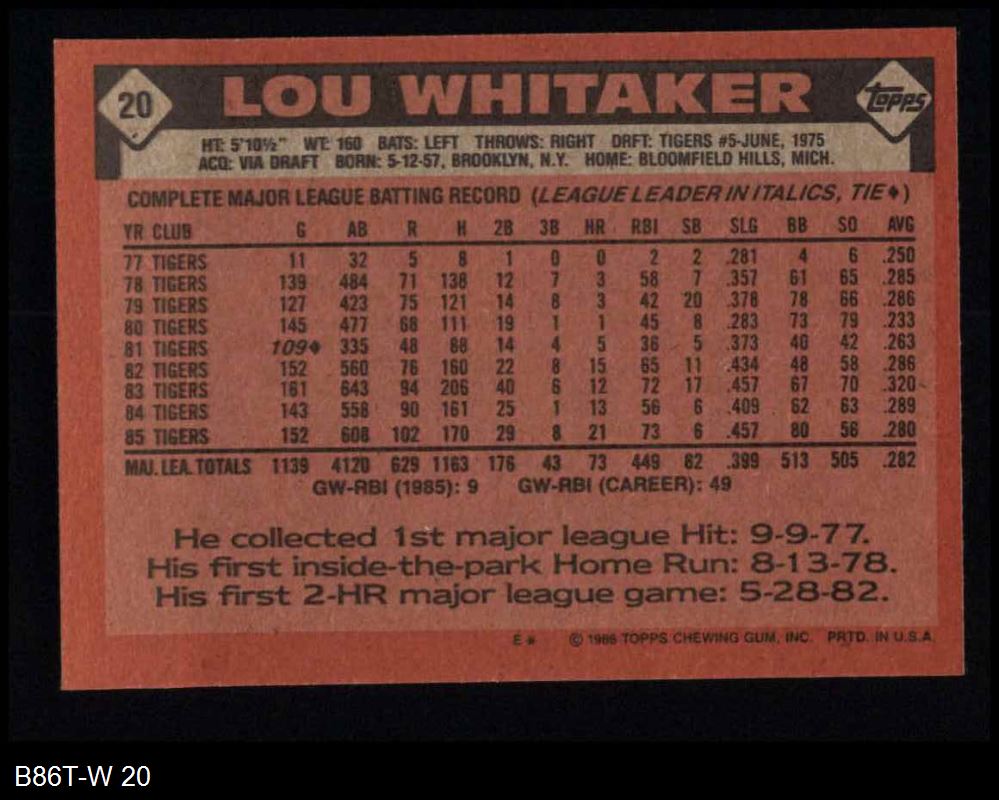 1986 Topps #20 Lou Whitaker