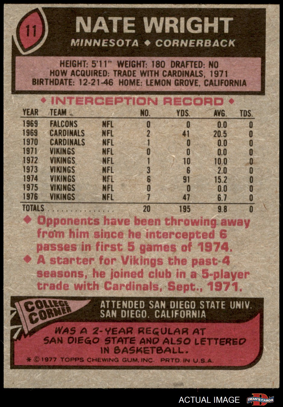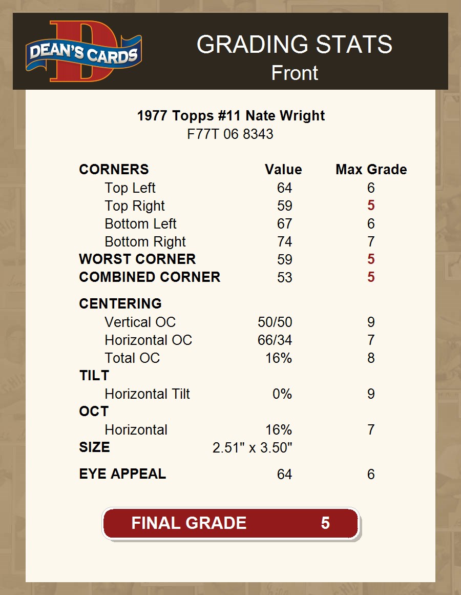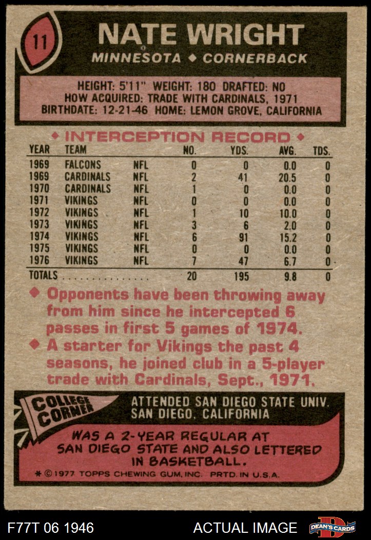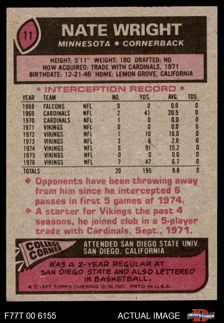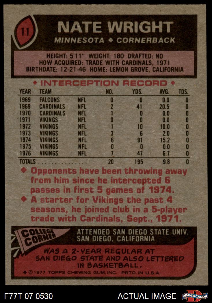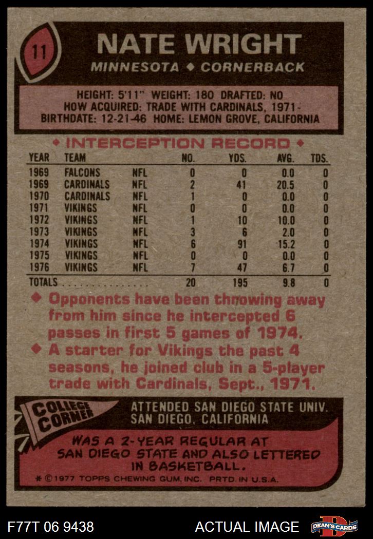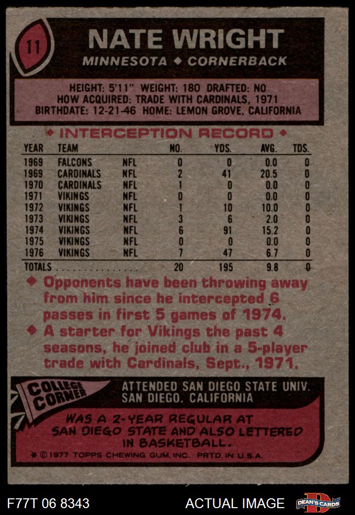 1977 Topps #11 Nate Wright 5 - EX