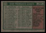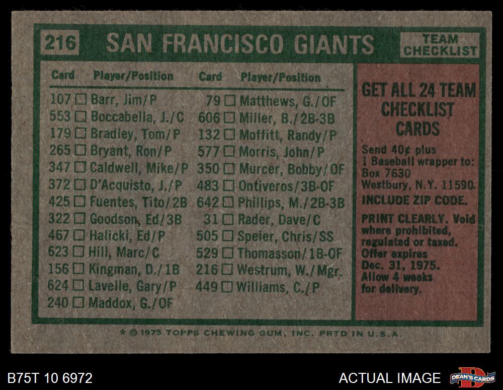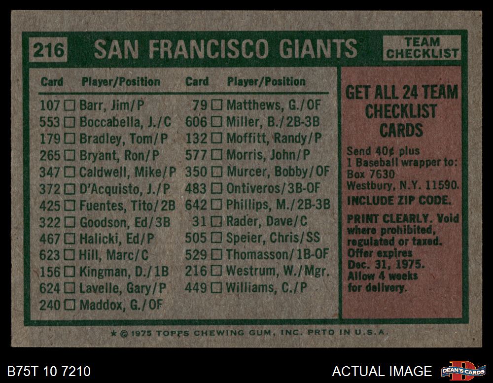 1975 Topps #216 - Wes Westrum Giants Team Checklist 4 - VG/EX