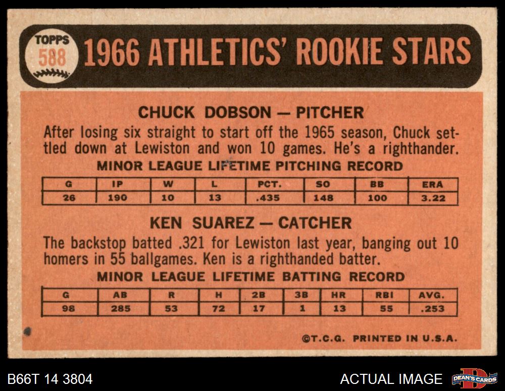 1966 Topps #588 - Chuck Dobson / Ken Suarez Athletics Rookies 5.5 - EX+