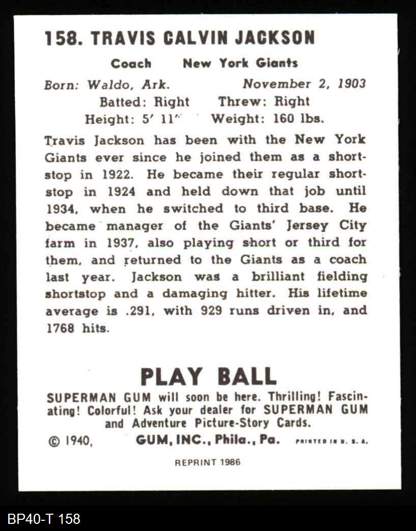 1940 Play Ball Reprint #158 Travis 'Stonewall' Jackson 8 - NM/MT