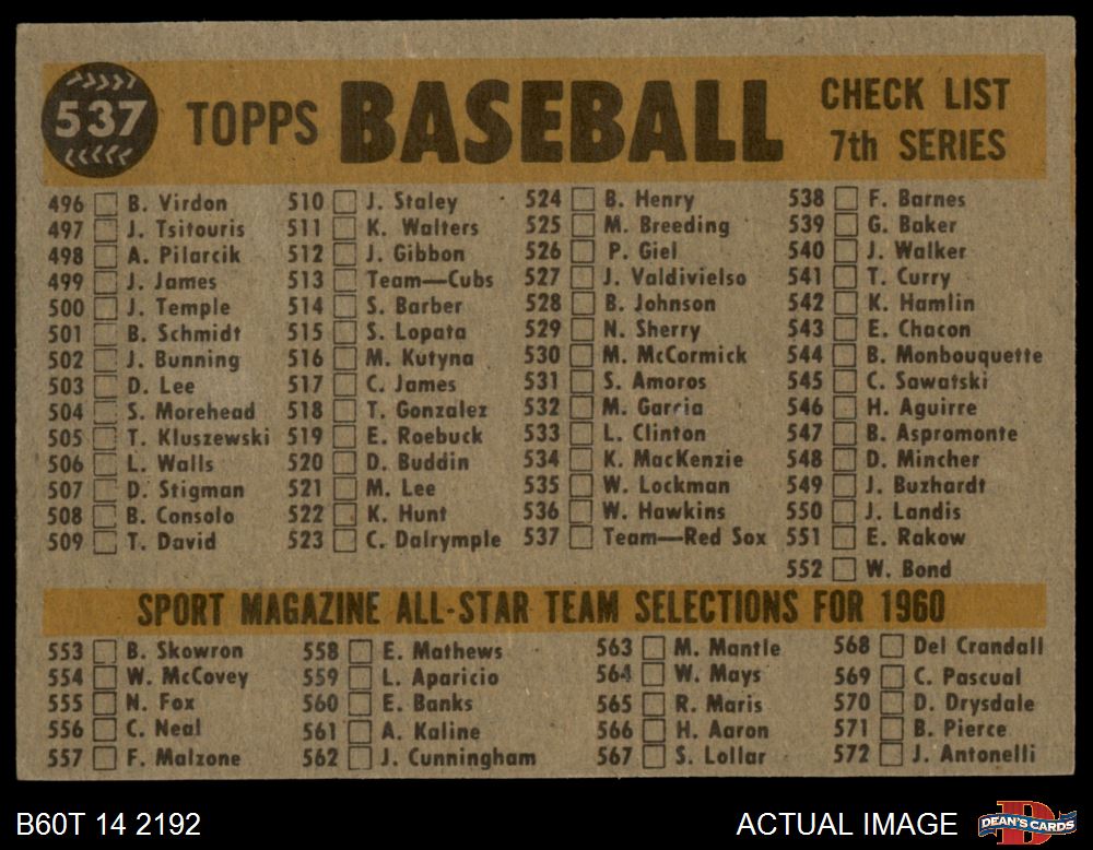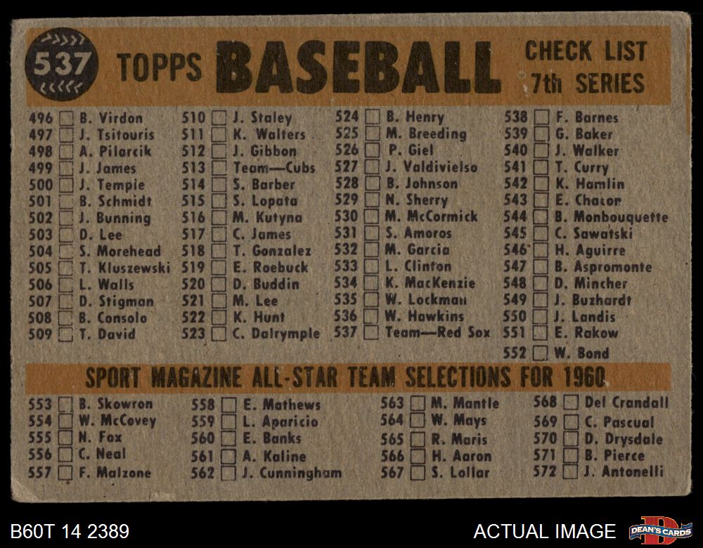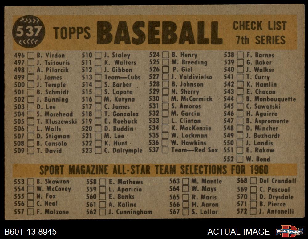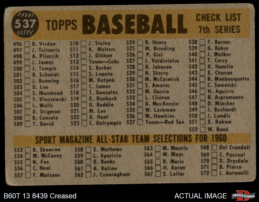 1960 Topps #537 Red Sox Team Checklist