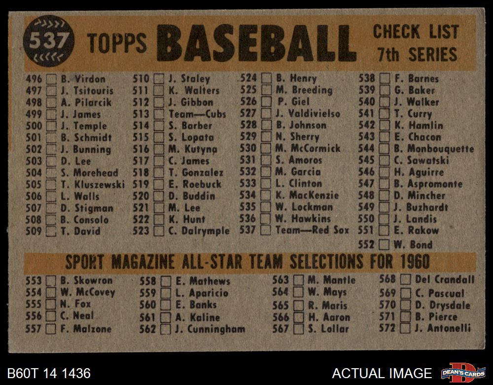 1960 Topps #537 Red Sox Team Checklist 5 - EX