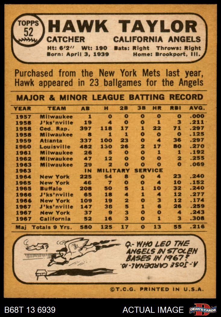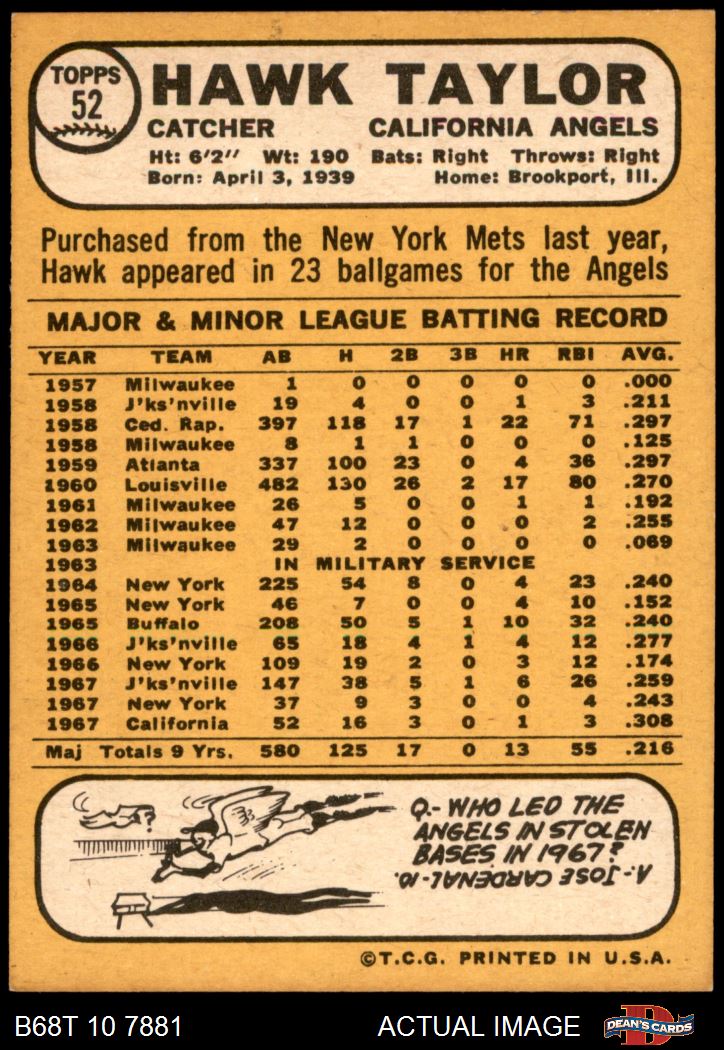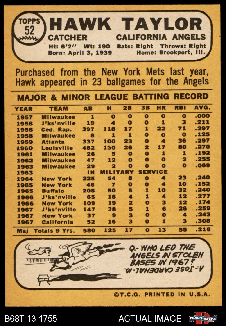1968 Topps #52 Bob Hawk Taylor 8 - NM/MT