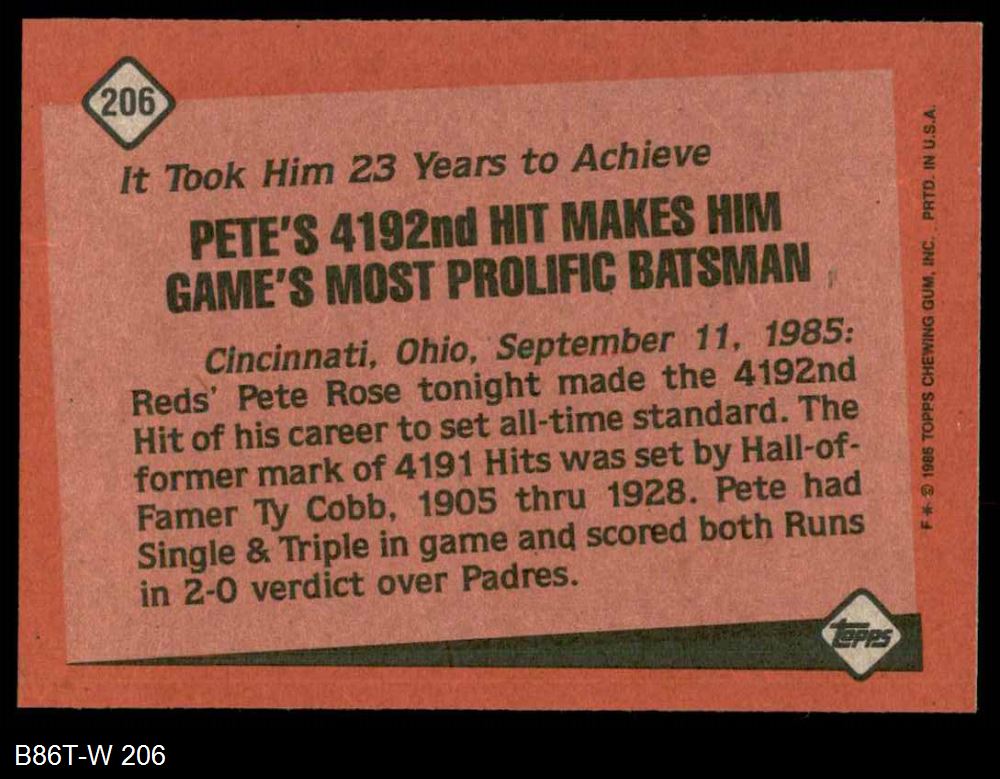 1986 Topps #206 - Pete Rose Record Breaker 8 - NM/MT