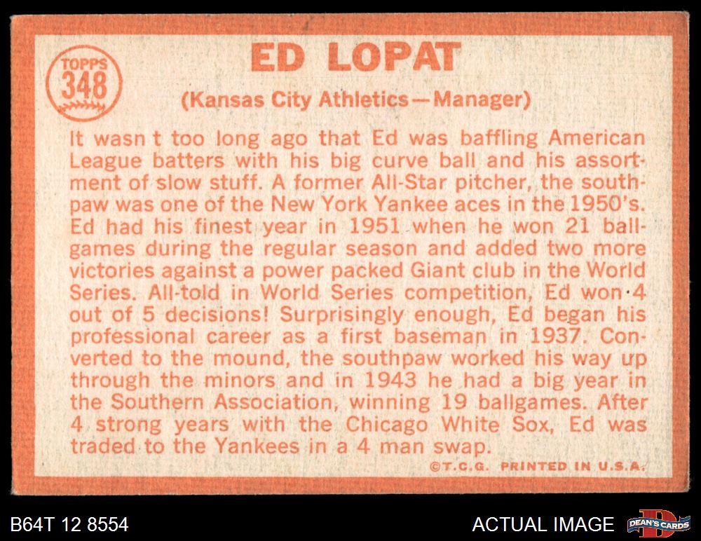 1964 Topps #348 Eddie Lopat 3 - VG