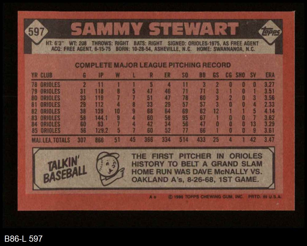 1986 Topps #597 Sammy Stewart 8 - NM/MT