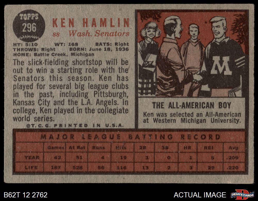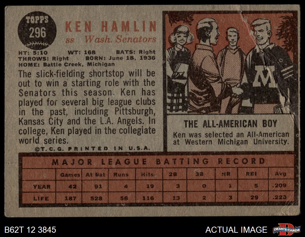 1962 Topps #296 Ken Hamlin 1.5 - FAIR