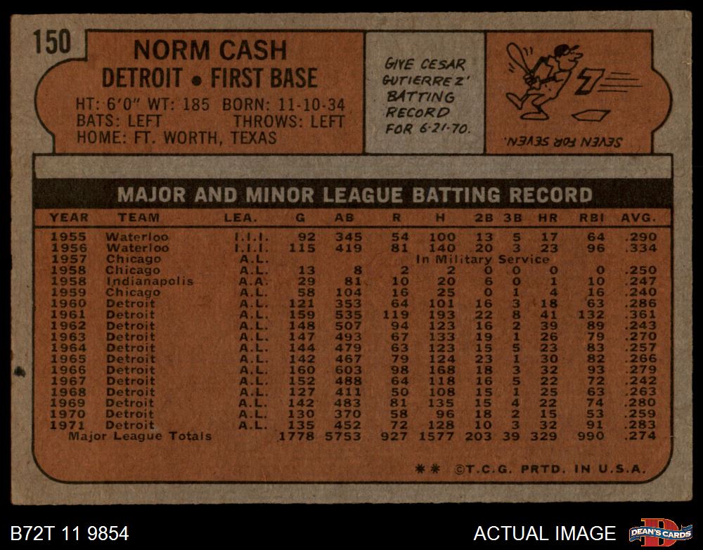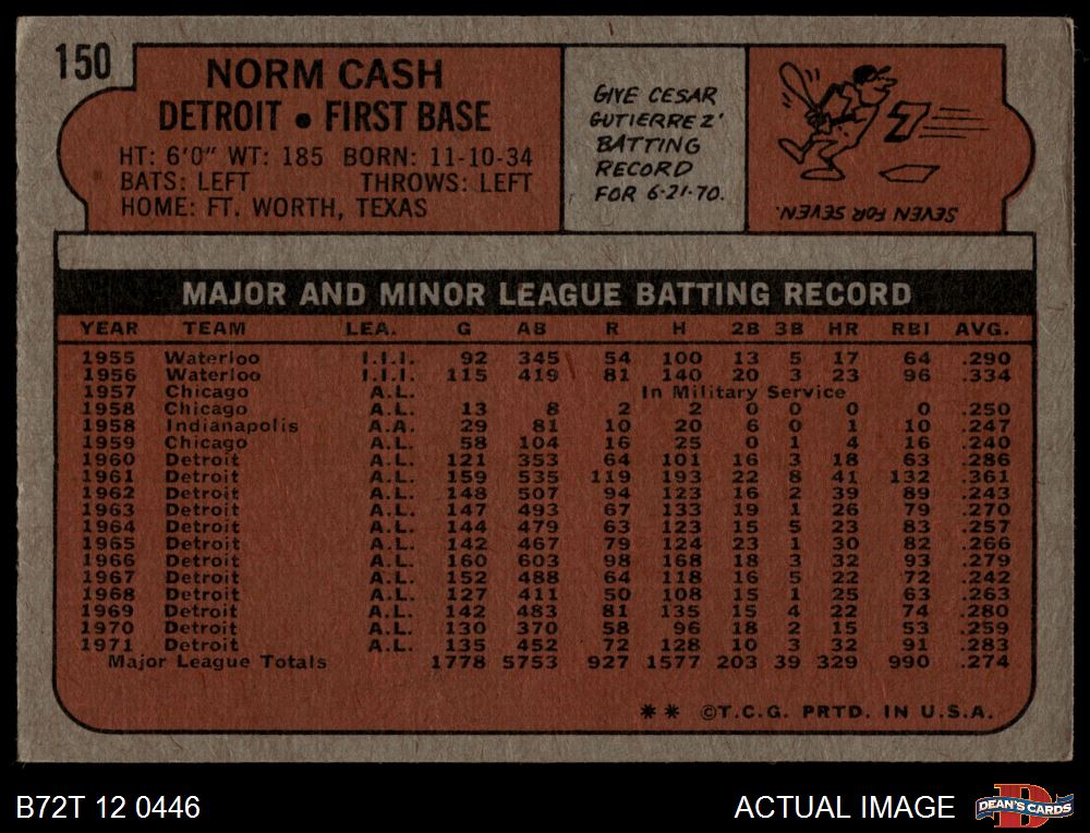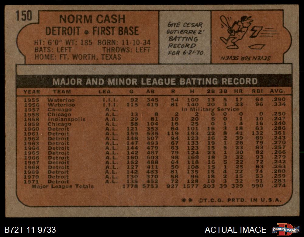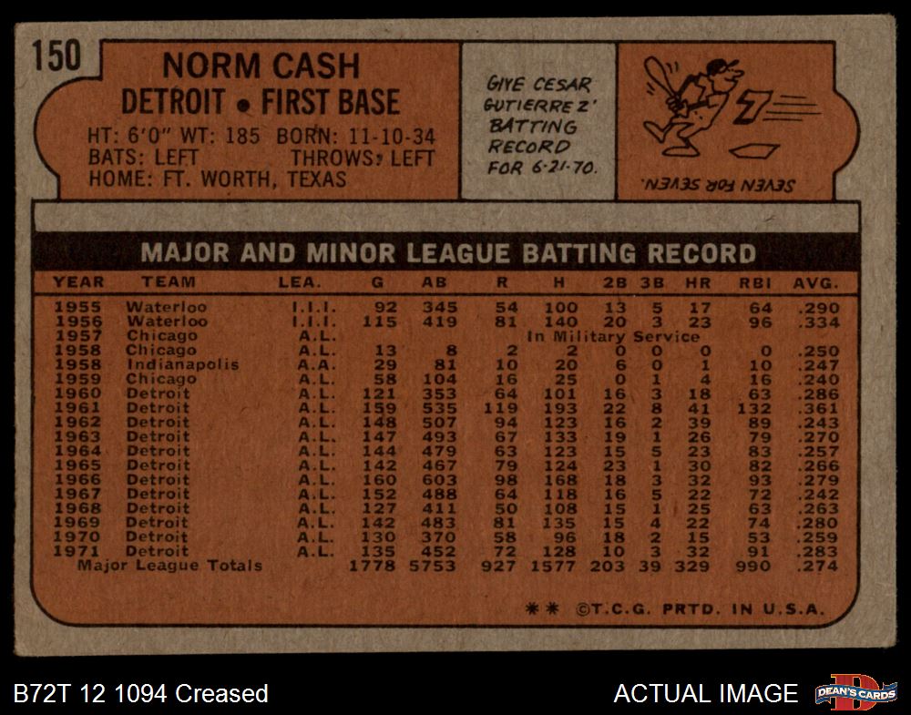1972 Topps #150 Norm Cash 2 - GOOD