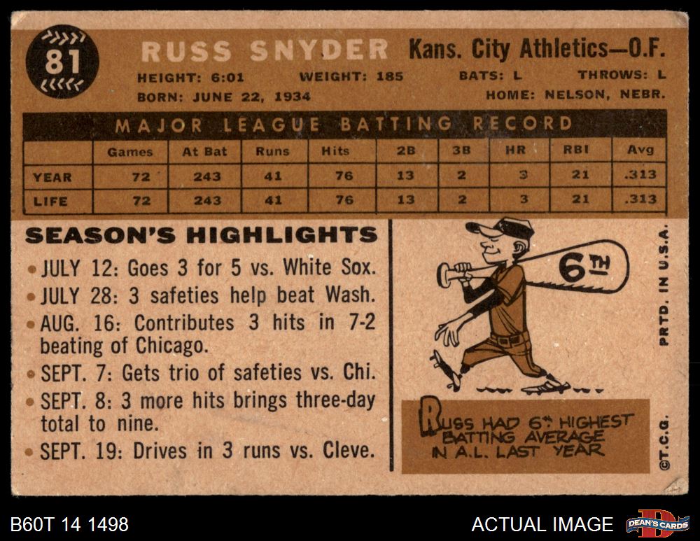 1960 Topps #81 Russ Snyder 2 - GOOD
