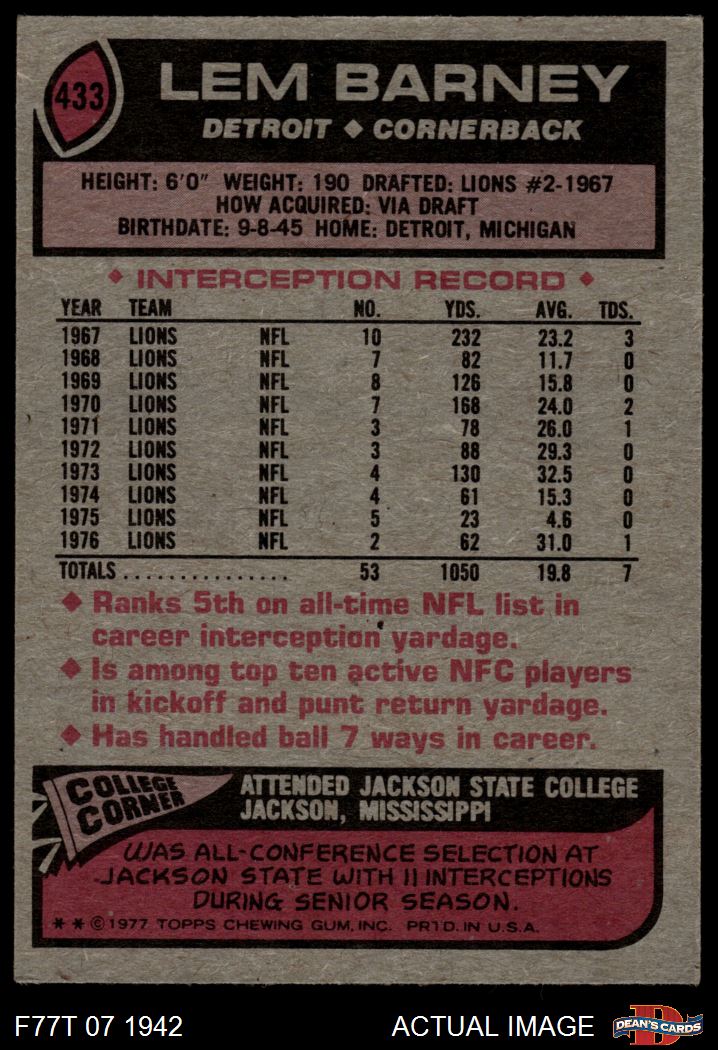 1977 Topps #433 Lem Barney