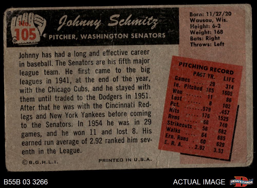 1955 Bowman #105 Johnny Schmitz 1 - POOR
