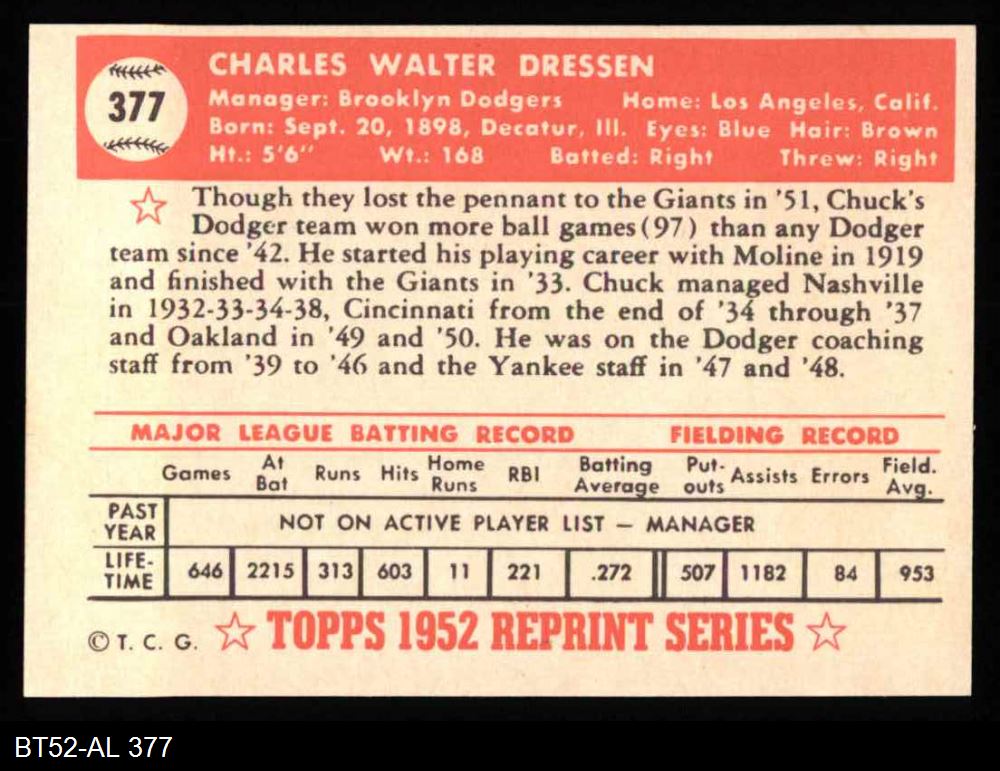 1952 Topps REPRINT #377 Chuck Dressen 8 - NM/MT