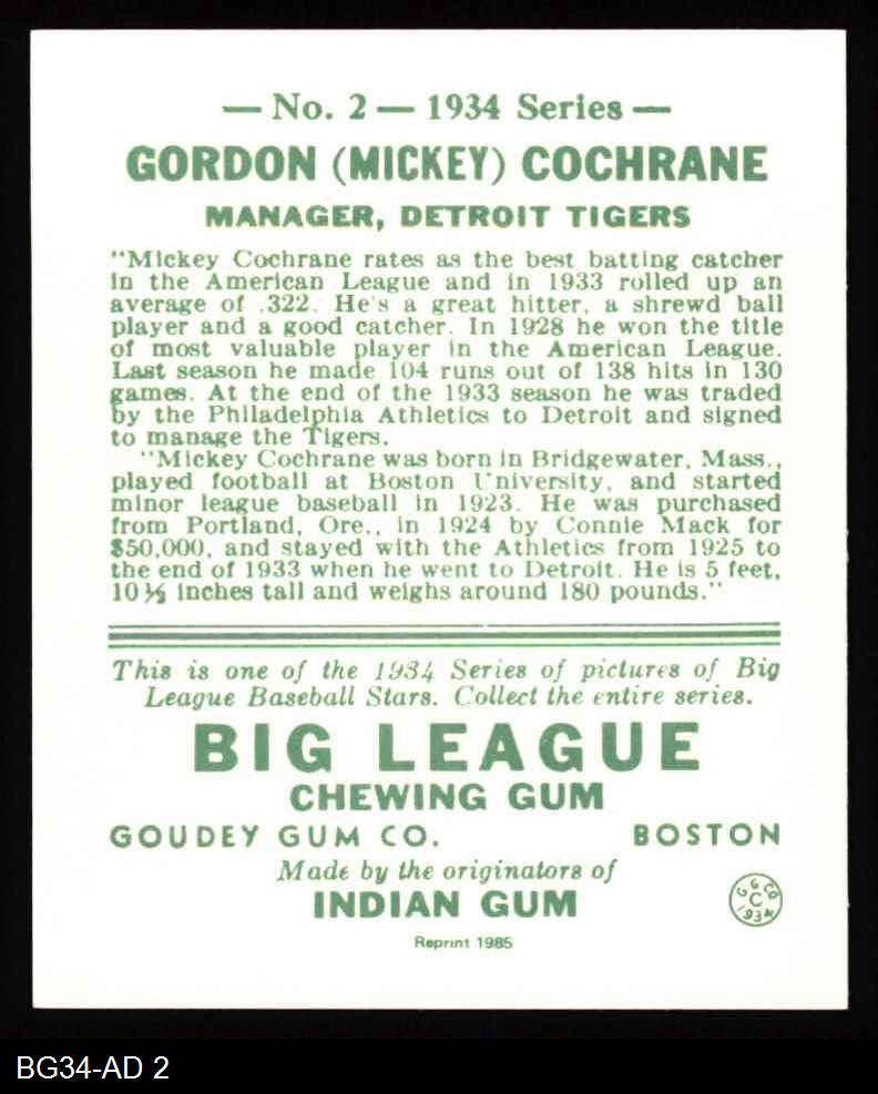 1934 Goudey Reprint #2 Mickey Cochrane