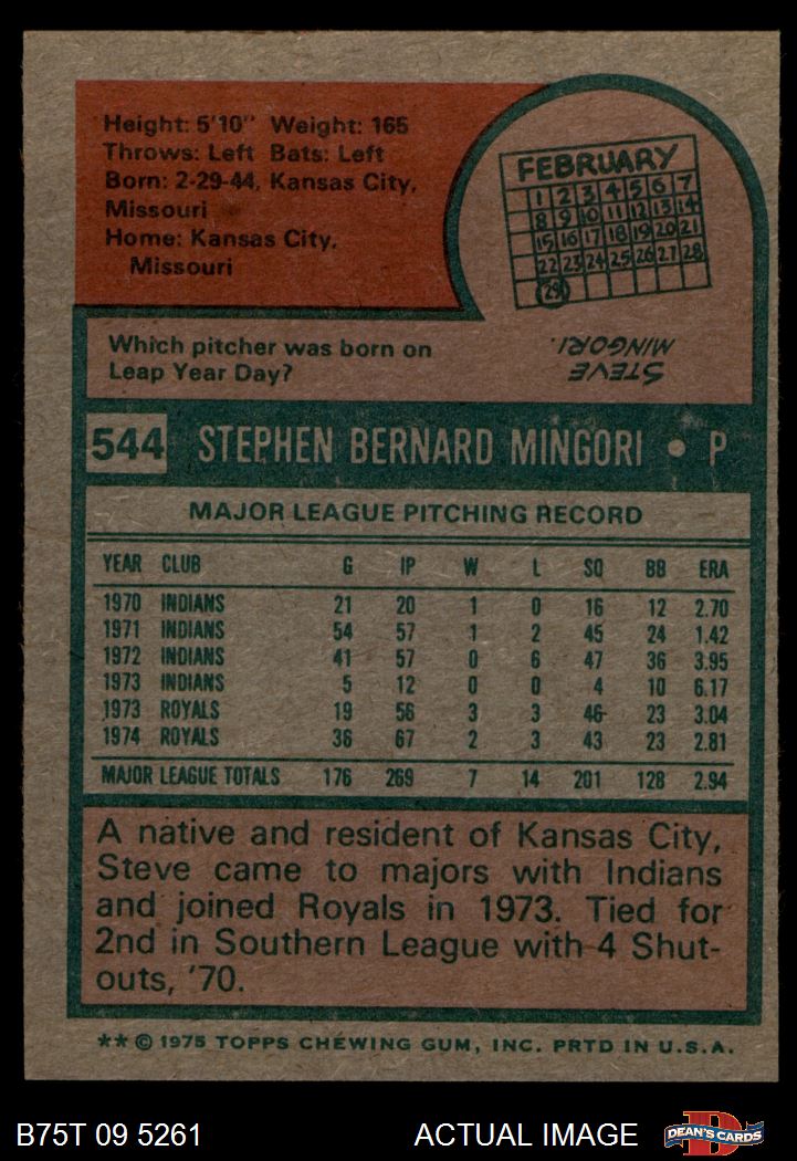 1975 Topps #544 Steve Mingori 7 - NM