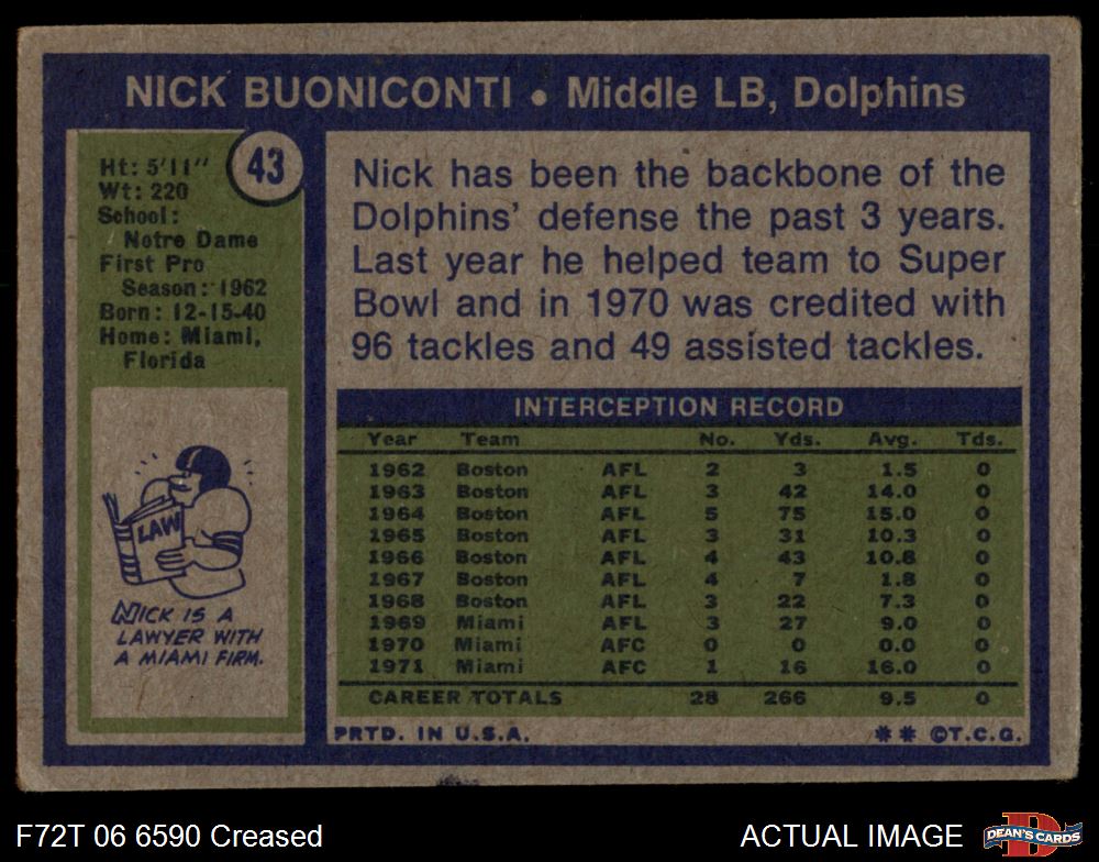 1972 Topps #43 Nick Buoniconti 1 - POOR
