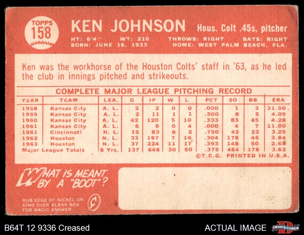 1964 Topps #158 Ken Johnson 1.5 - FAIR
