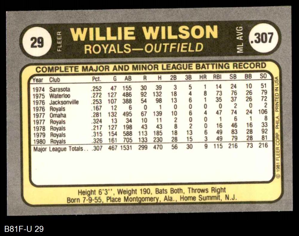 1981 Fleer #29 Willie Wilson 8 - NM/MT