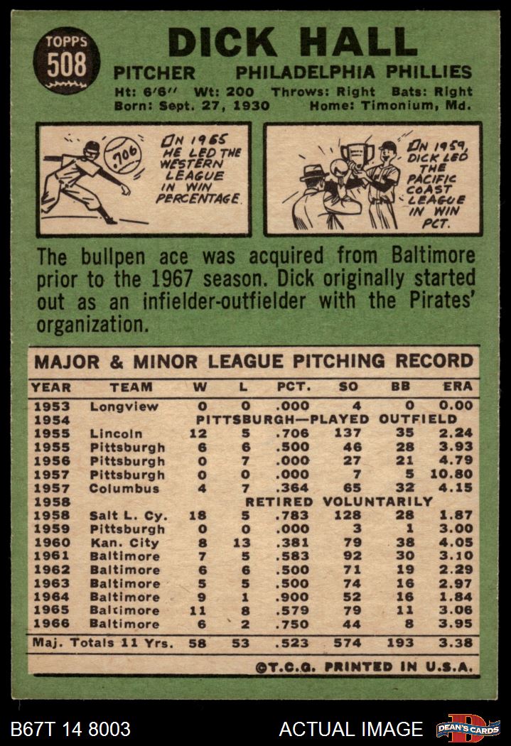 1967 Topps #508 Dick Hall 4 - VG/EX
