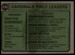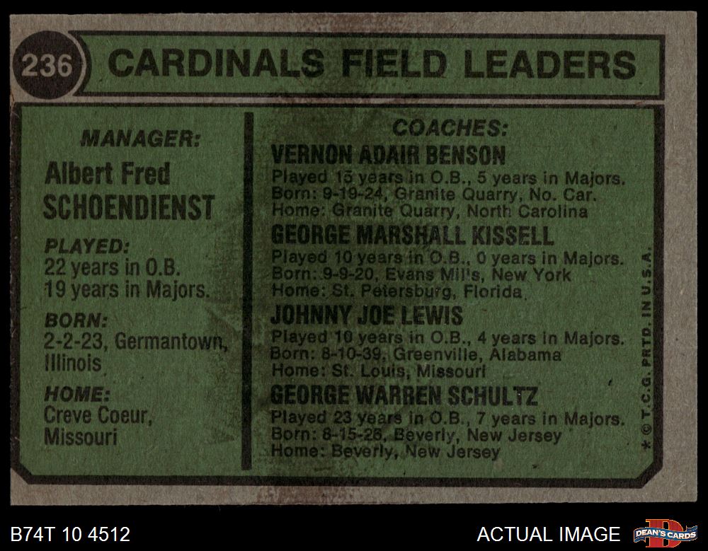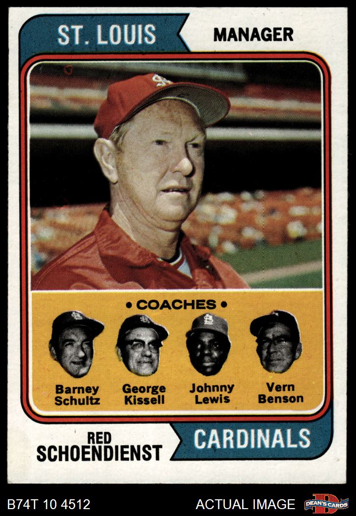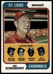 1974 Topps #236 - Red Schoendienst / Vern Benson / George Kissell / Johnny Lewis / Barney Schultz Cardinals Leaders 3 - VG