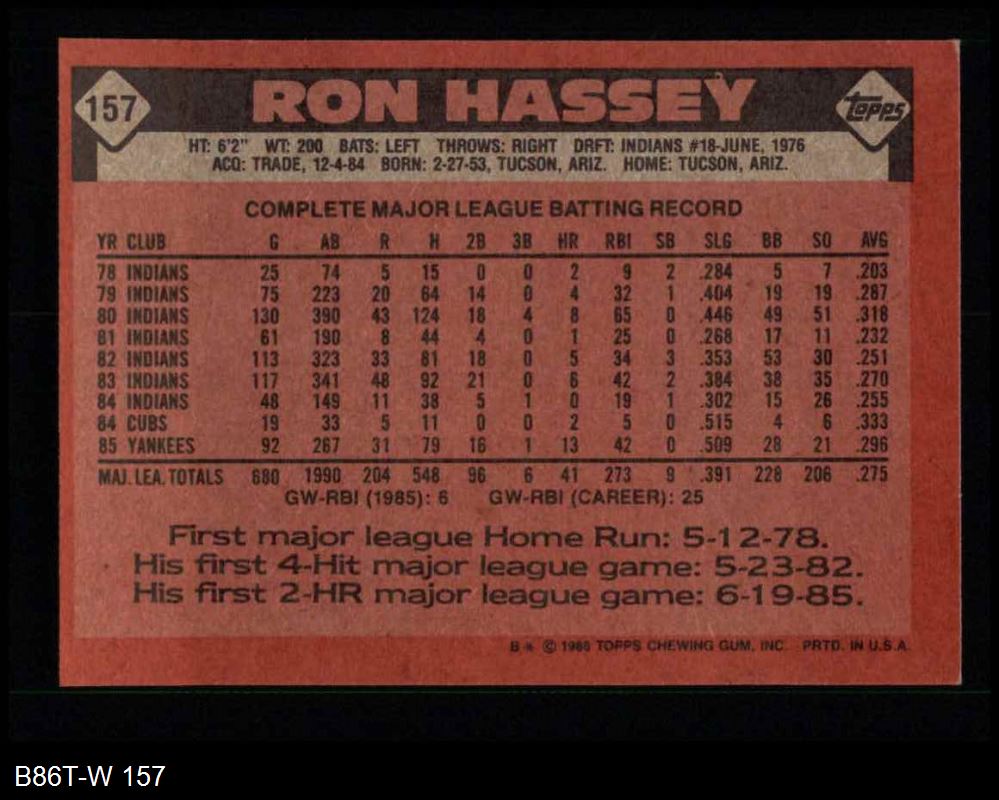 1986 Topps #157 Ron Hassey 8 - NM/MT