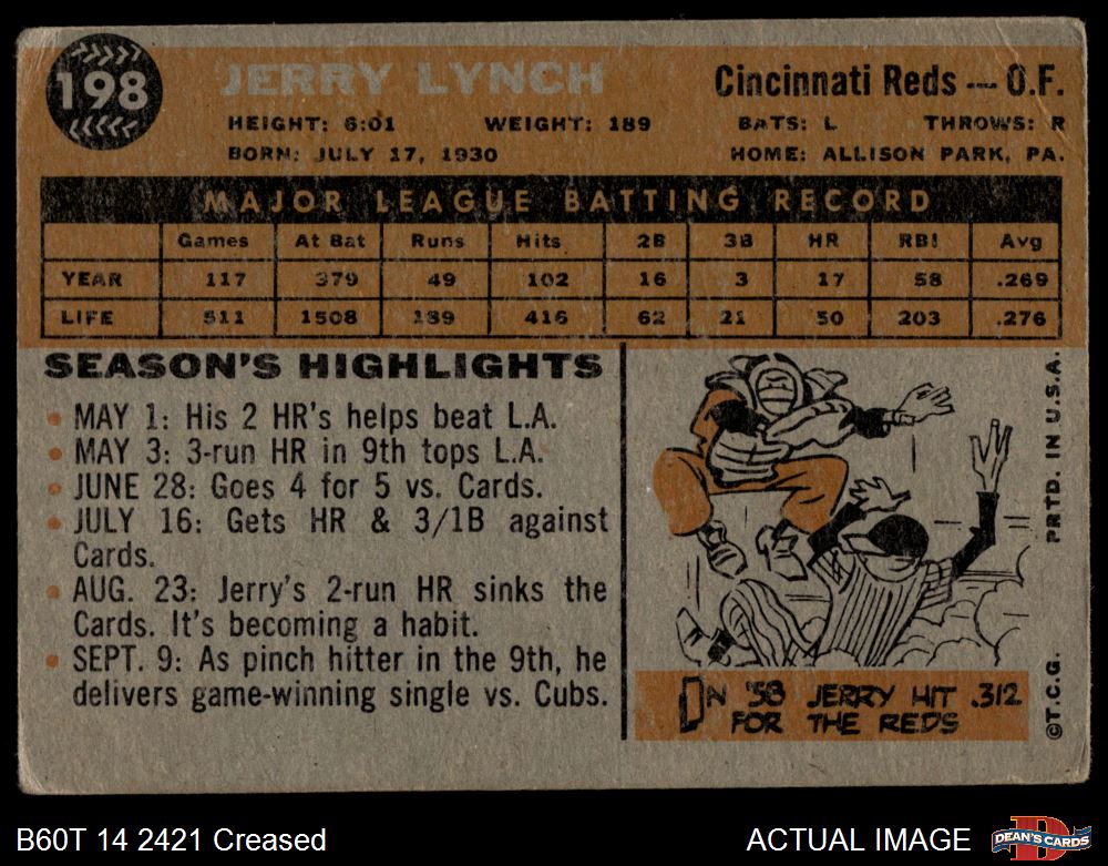 1960 Topps #198 Jerry Lynch 2 - GOOD