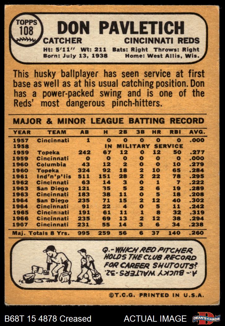 1968 Topps #108 A Don Pavletich 3 - VG
