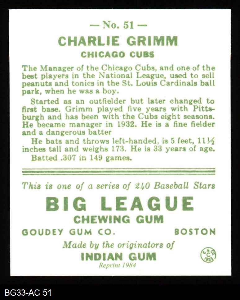 1933 Goudey Reprint #51 Charlie Grimm 8 - NM/MT