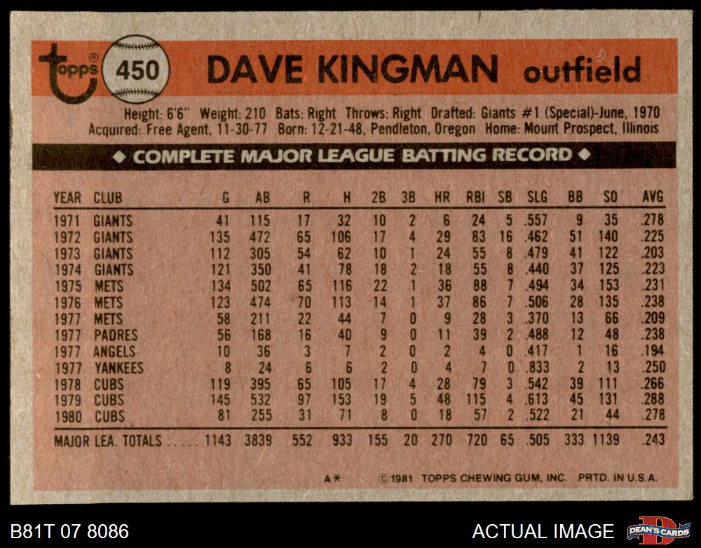 1981 Topps #450 Dave Kingman 6 - EX/MT