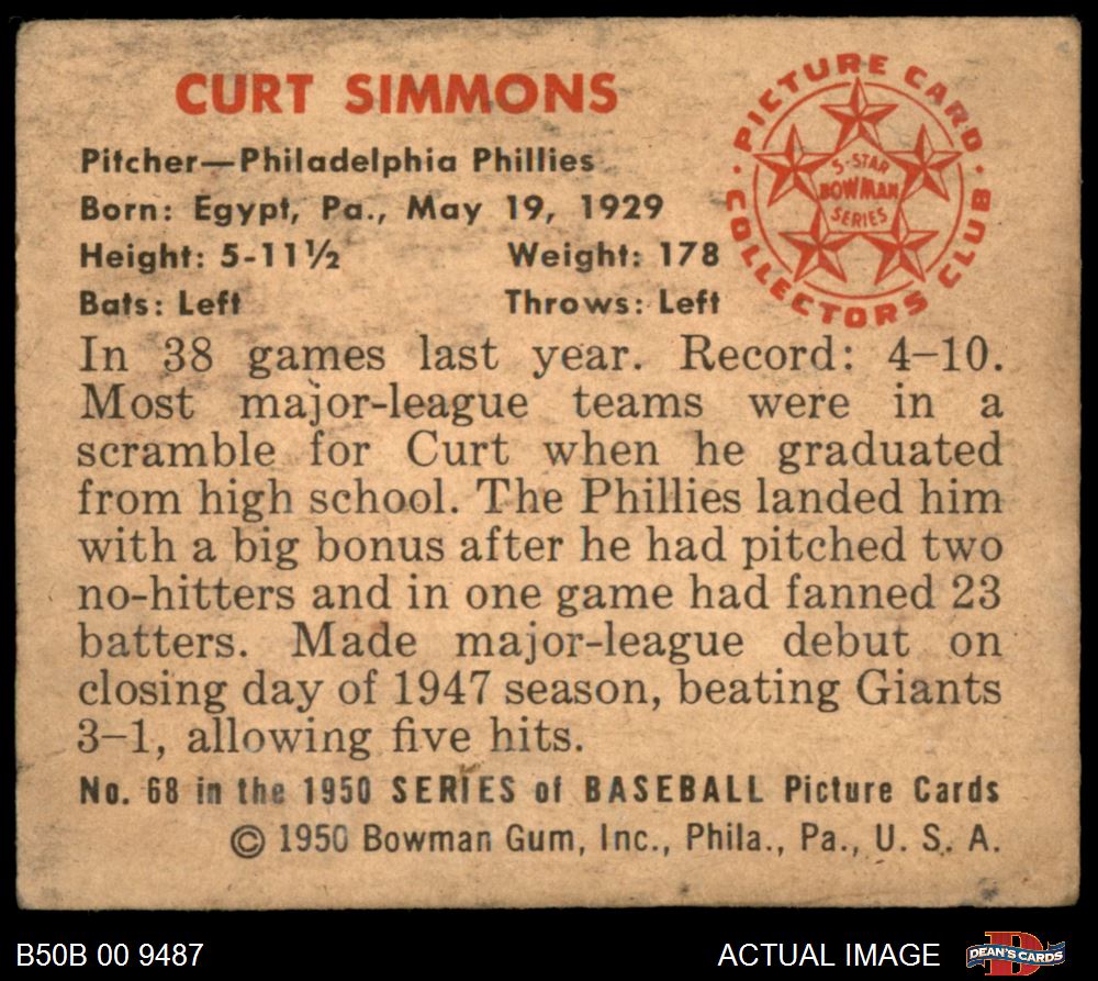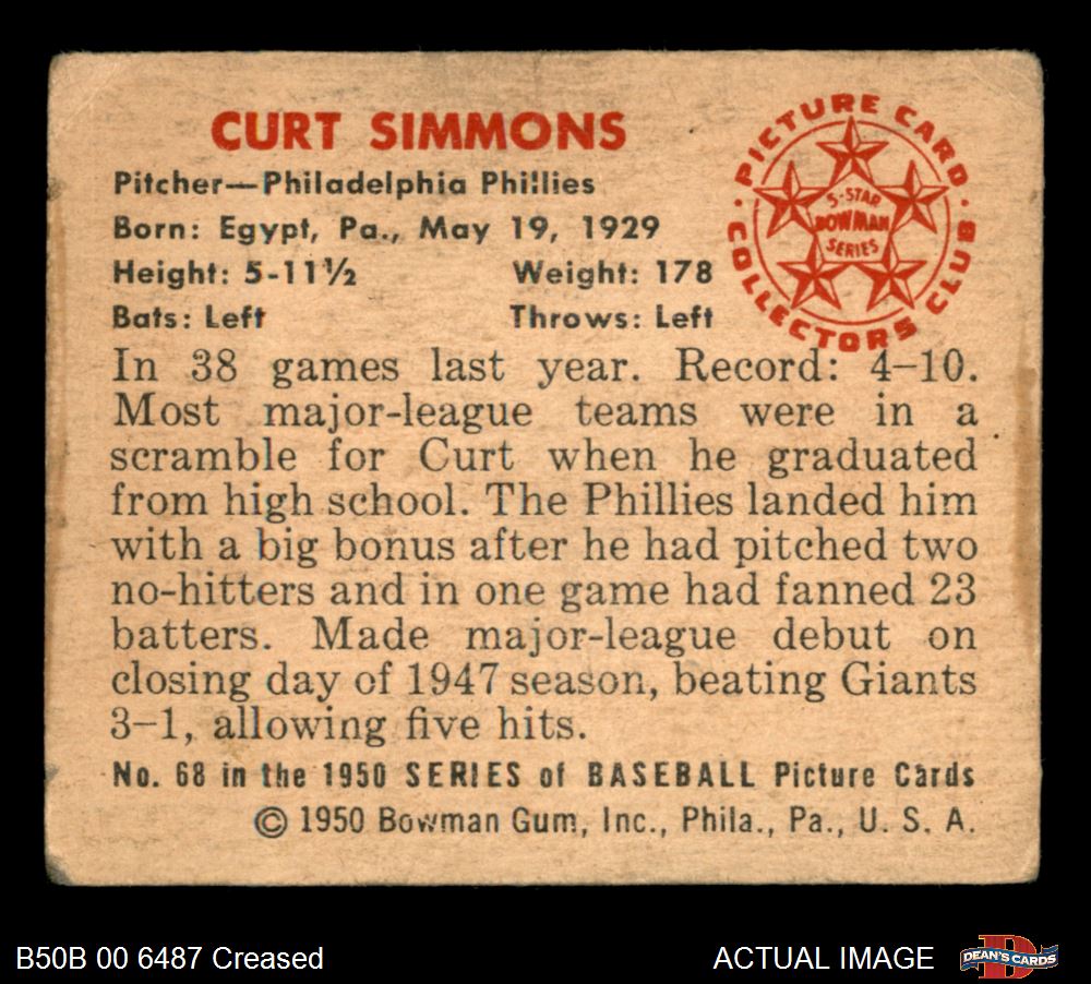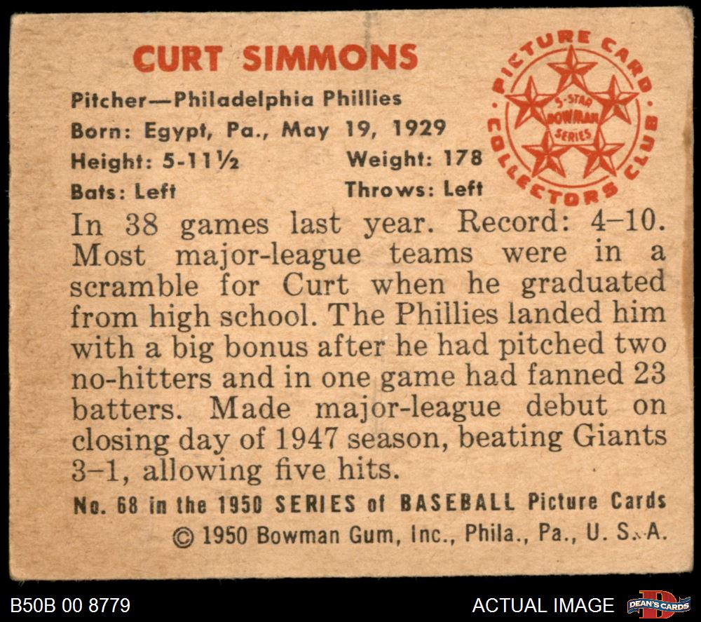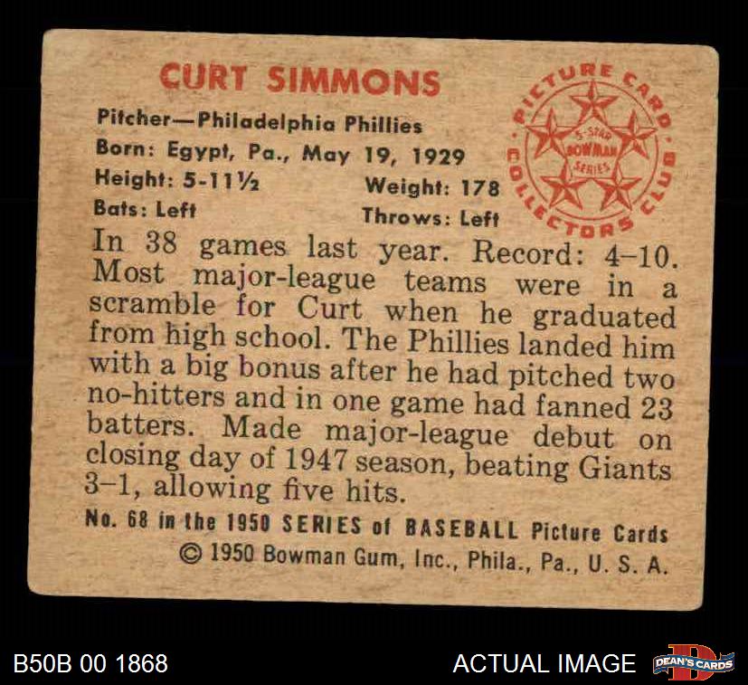 1950 Bowman #68 Curt Simmons 2 - GOOD