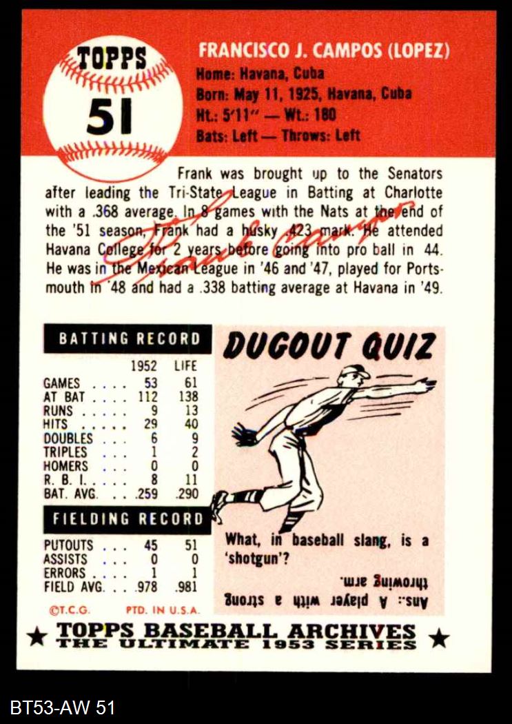 1953 Topps Archives #51 Frank Campos 8 - NM/MT