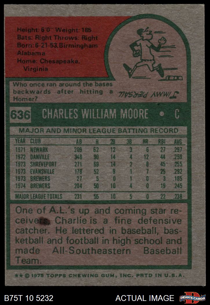 1975 Topps #636 Charlie Moore 6 - EX/MT