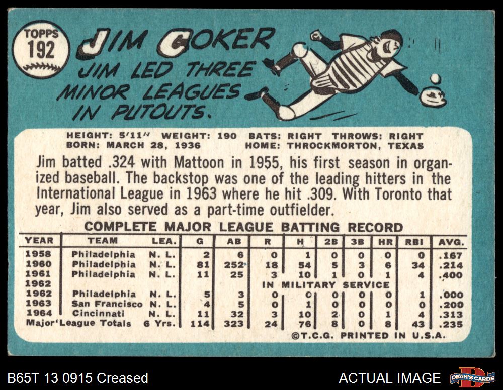 1965 Topps #192 Jim Coker Front Thumbnail