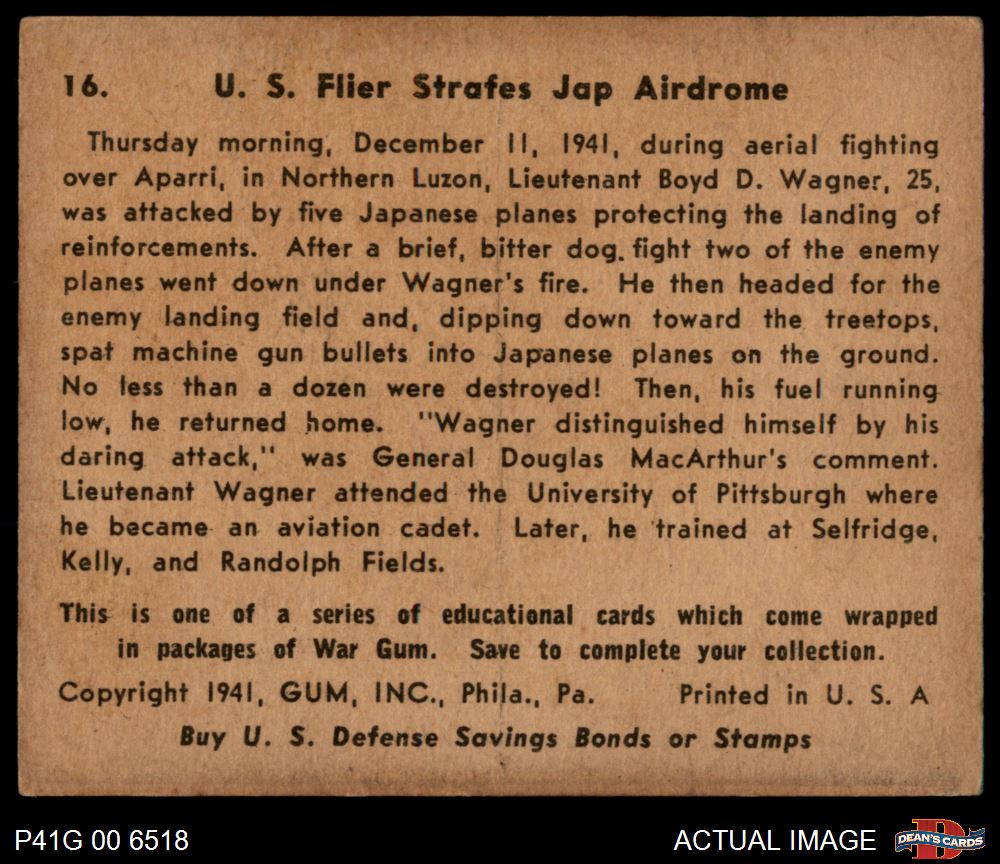1941 War Gum #16 U.S. Flier Strafes Japanese Airdrome 3.5 - VG+