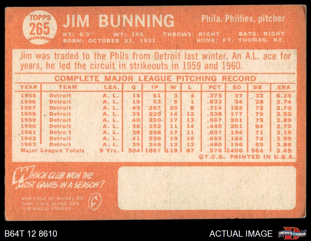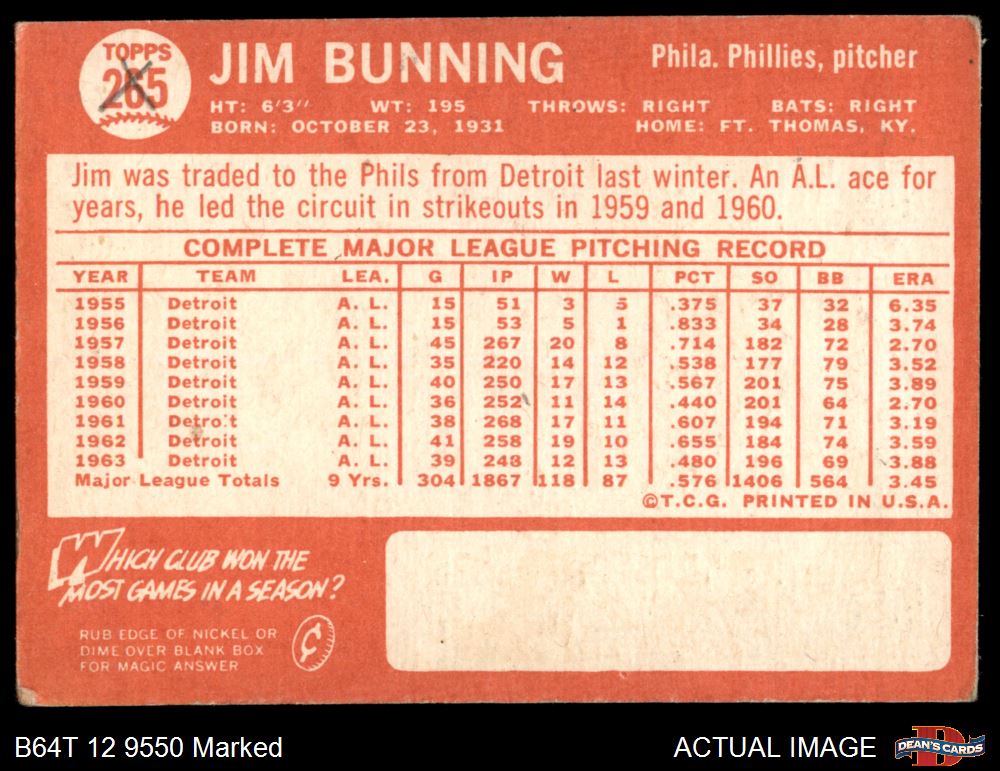 1964 Topps #265 Jim Bunning 1.5 - FAIR
