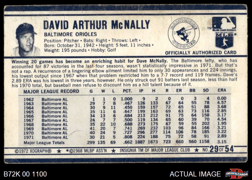 1972 Kellogg's #29 Dave McNally 2 - GOOD