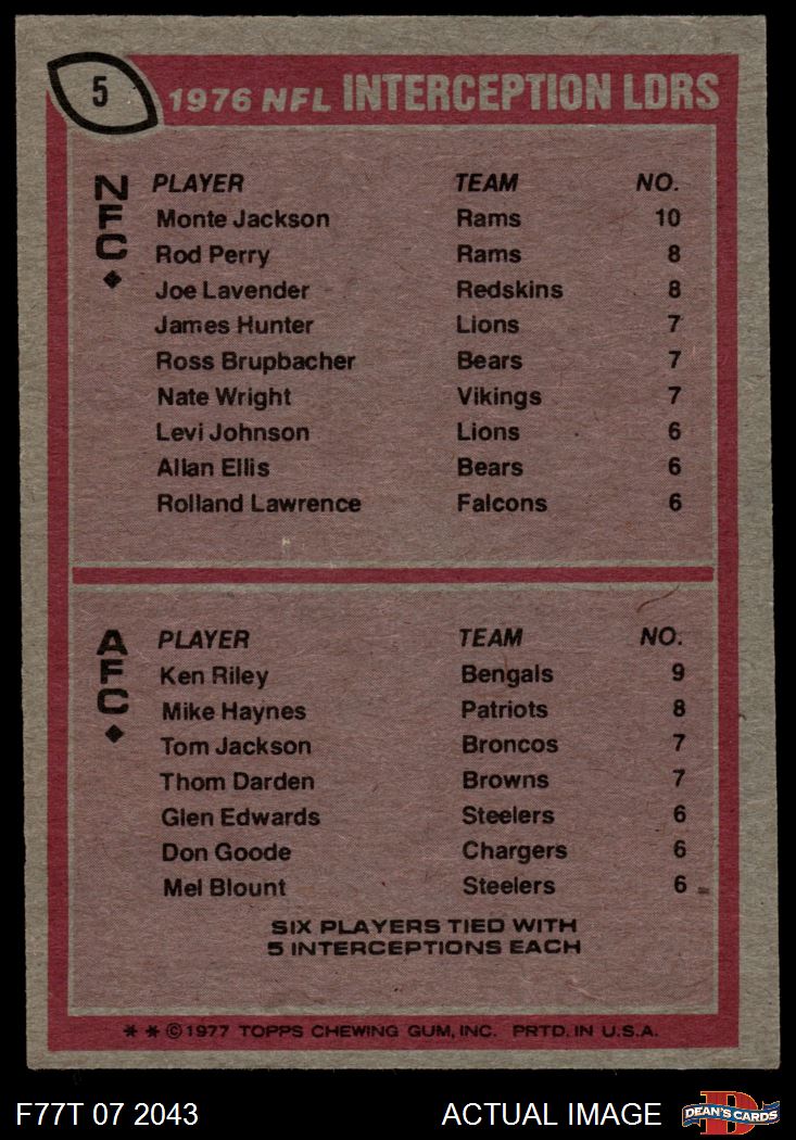 1977 Topps #5 - Monte Jackson / Ken Riley Interception Leaders 5 - EX