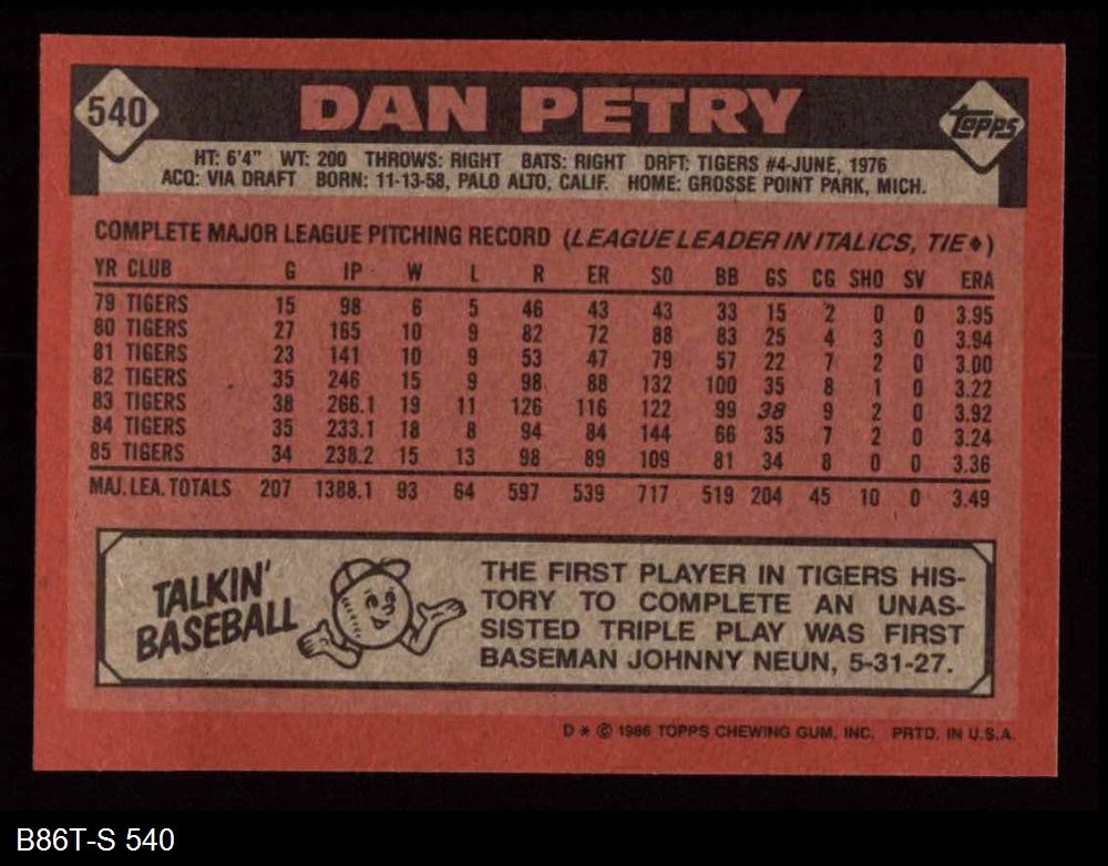1986 Topps #540 Dan Petry