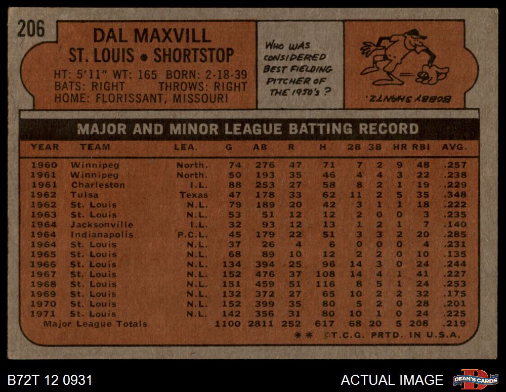 1972 Topps #206 Dal Maxvill 3.5 - VG+