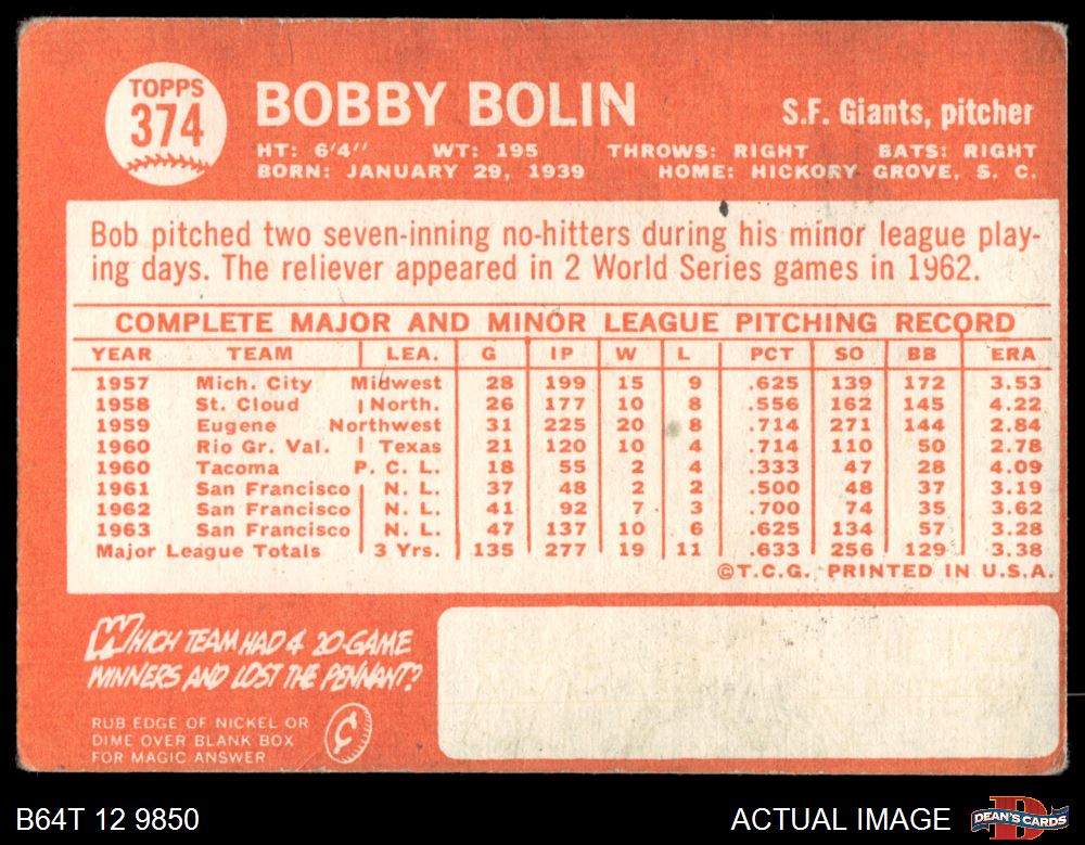 1964 Topps #374 xSTR Bobby Bolin Front Thumbnail