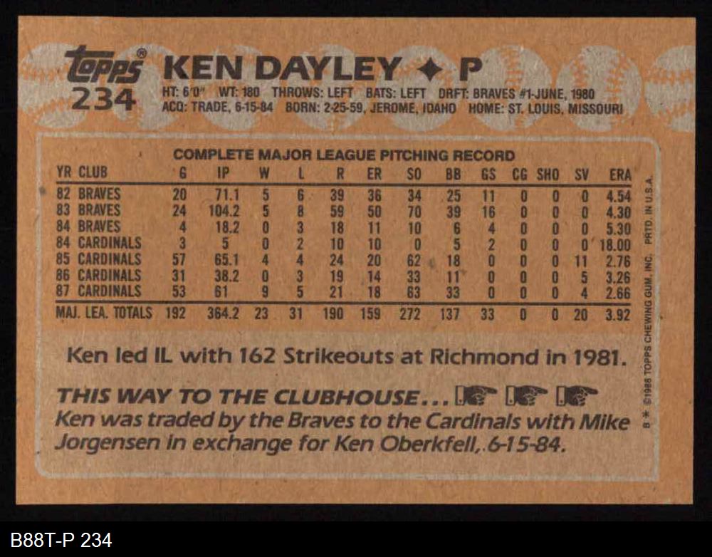 1988 Topps #234 Ken Dayley 8 - NM/MT