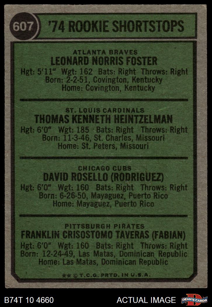 1974 Topps #607 - Frank Taveras / Leo Foster / Tom Heintzelman / Dave Rosello Rookie Shortstops 3 - VG