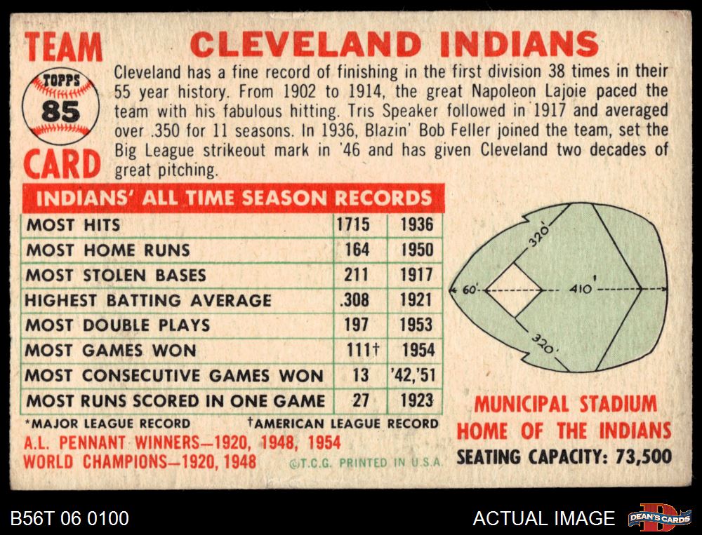 1956 Topps #85 CEN Indians Team 3 - VG