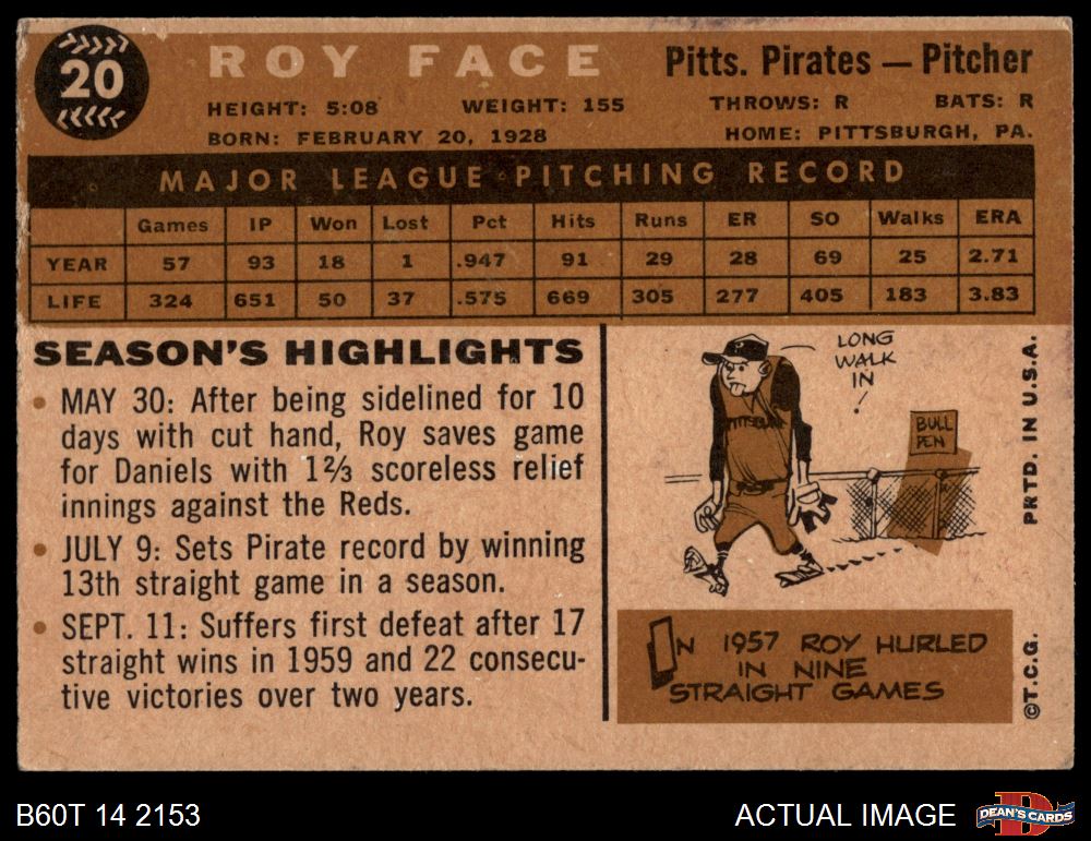 1960 Topps #20 Roy Face 2 - GOOD